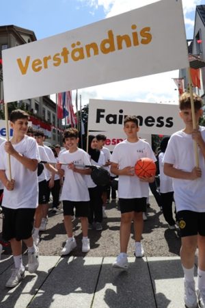 Dass es vor allem dieses Miteinander ist,das zählt,war während des Maientages allerorten zu spüren. Im Umzug und auch bei den Schulaufführungen in der EWS Arena thematisierten die Schülerinnen und Schüler immer wieder ihren Wunsch nach Respekt,Toleranz und Fairness. Ausdruck des guten Miteinanders waren alleine schon die gemeinsam erprobten Auftritte beim Ansingen und den Schulaufführungen,wie auch die gezeigte Freude beim gemeinsamen Umzug.
