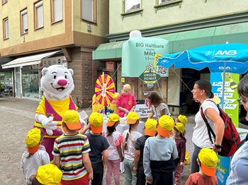 Beim Wochenmarkt am 5. Juni 2024 war in der Fußgängerzone buchstäblich der Bär los. „Der sogenannte Trenn-Bär erklärte live und unterhaltsam wie richtige Mülltrennung funktioniert und warum sie so wichtig ist“,sagt die städtische Umweltbeauftragte Sonja Pfau. Der fröhliche Eisbär in der Arbeitskleidung eines Müllwerkers begeisterte Erstklässler der Uhlandschule und Kinder aus dem Wölkkindergarten,die extra wegen ihm in die Fußgängerzone gekommen waren. Er zeigte ihnen,wie einfach sie Abfälle richtig trennen und so einen wichtigen Beitrag zum Umweltschutz leisten können. Dabei wussten die Kinder zum Teil bereits sehr gut über die richtige Mülltrennung Bescheid und nahmen strahlend zum Abschied ihre Geschenke vom Trenn-Bär in Empfang.