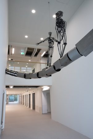 Auf der Nord- und Südseite im Lichthof des dritten und vierten Stockwerks entstanden so zwei Stahl-Skulpturen von 290 kg,die per Stahlseilen von der Decke abhängen. Die Montage wurde von der Fa. Stahlbau Nägele übernommen. Die Objektinstallation besteht in jedem der beiden zweigeschossigen Räume aus einem quer durch den Raum auf etwa 2,70 m bis 3 m Höhe laufenden Ast und jeweils zwei menschlichen Figuren,die gemeinsam über den Ast balancieren.