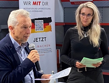 Foto: Wolfgang Amann (l.) und Susanne Gminder vom Arbeitskreis kommunal der Mittelstandsunion (MIT) informieren rund 50 interessierte Unternehmer aus dem Landkreis über die aktuelle Diskussion zur Nachnutzung der Klinik am Eichert. Foto: MIT/Rüdiger Gramsch