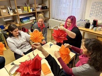 Foto (Stadtverwaltung Geislingen an der Steige / Christiane Wehnert): Gemeinsam kreativ und im Austausch: Beim KIFA-Treffen im Kindergarten „Bunte Welt an der Hochschule“ bastelten Mütter Weihnachtssterne. KIFA-Fachkraft Sabrina Schmid (2. v. l.),KIFA-Mentorin Sarah Häuser (3. v. l.) und Gülgün Yildirim von der Stadtverwaltung (rechts) unterstützten dabei und sprachen über Erziehungsfragen.