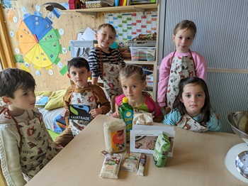 „Da ist ja das faire Zeichen drauf“,entdeckte ein Kind des Naturkindergartens Wiesenwichtel,als sich die Vorschulgruppe die Zutaten für das faire Plätzchenbacken anschauten. Die Vorschulkinder beschäftigten sich bereits im letzten Jahr bei einem Bananenprojekt mit den Hintergründen von fairem Handel und der Herkunft von Bananen. In diesem Kindergartenjahr wird Fairtrade mit dem Produkt Schokolade weiter vertieft. Als genussvollen Auftakt in das Thema hat der Kindergartengarten Wiesenwichtel nun Plätzchen mit fair gehandelten Zutaten gebacken – und da durfte Fairtrade-Schokolade natürlich nicht fehlen. Die leckeren Plätzchen wurden anschließend mit den anderen Kindern geteilt. Was fairer Anbau genau bedeutet,erfahren die Kinder dann im Frühjahr beim Schokoladenprojekt,wenn sie sich auf ein Schokoladenabenteuer begeben.