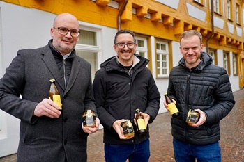 Foto (Stadtverwaltung Geislingen an der Steige / Christiane Wehnert): Oberbürgermeister Frank Dehmer,Thorsten Bopp und Christoph Kumpf mit dem neuen Radler-Gsälz (von links nach rechts)