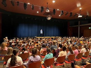 Foto (Bildquelle: Stadt Eislingen): Große Spannung! Gleich öffnet sich der Vorhang für das Schülertheater. Rund 470 Schulkinder folgen der Einladung in die Stadthalle.