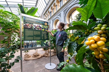 Foto (Wilhelma Stuttgart/Birger Meierjohann): Wilhelma-Gärtnerin Fenja Baumgärtner inmitten der gerade eröffneten Kaffee-Ausstellung.