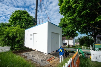 Diese Woche wurde ein weiterer zentraler Baustein für den Glasfaserausbau in Jebenhausen errichtet: Das Technikgebäude – der sogenannte Point of Presence (PoP) – wurde an der Max-Herz-Straße aufgestellt. Die Montage verlief routiniert und präzise auf der dafür vorgesehenen Fläche.