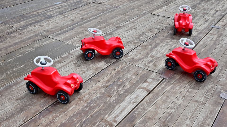 Bobbycars warten auf junge Fahrerinnen und Fahrer