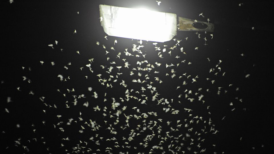 Eintagsfliegen schwirren unter einer Straßenlaterne