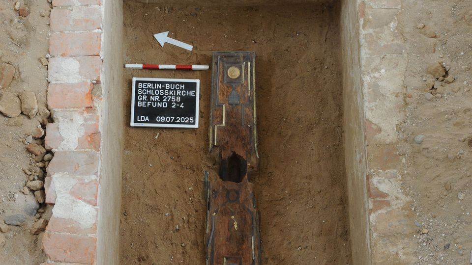 »In der rechteckigen,gemauerten und mit Erde verfüllten Gruft fand sich der gut erhaltene,mit zahlreichen vergoldeten Leisten und Medaillons verzierte Holzsarg«,sagte der Archäologe Sebastian Heber vom Landesdenkmalsamt. »Der Fund ist außergewöhnlich: Die Grablege liefert uns wertvolle Einblicke in eine herausragende Frauenbestattung am Ende des 18. Jahrhunderts.«