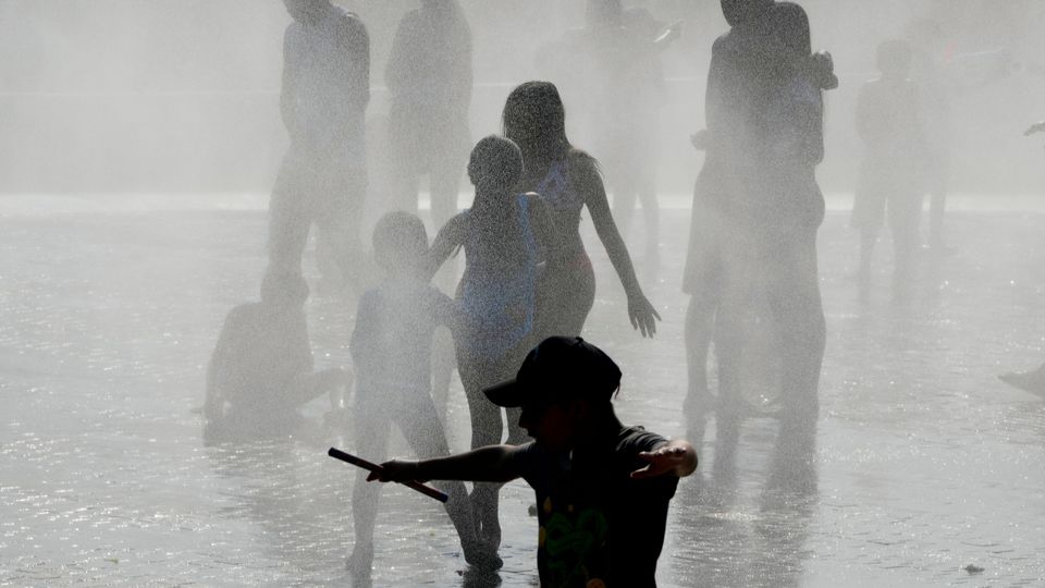 In Madrid kühlen sich Menschen in einem Brunnen ab