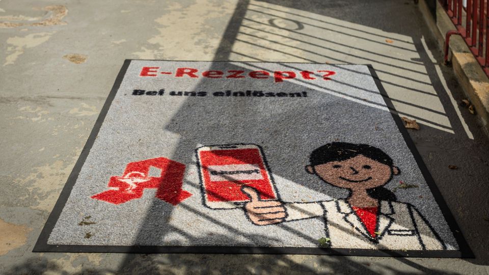 »E-Rezept? Bei uns einlösen!«: Werbeteppich vor dem Eingang einer Apotheke