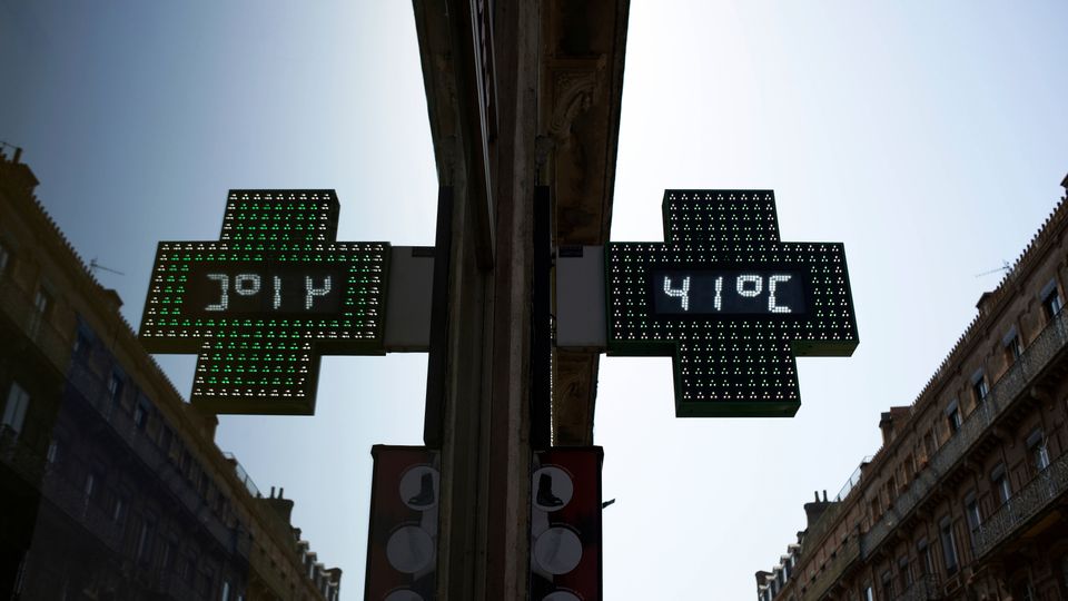 Temperaturanzeige vor einer Apotheke im französischen Toulouse (im August 2025)