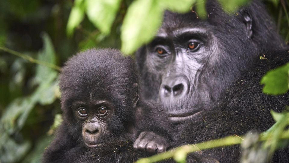 Gorilla mit Nachwuchs (im Bwindi Impenetrable National Park in Uganda): Womöglich stimmt die Mutter-Hypothese