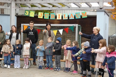 Die Kinder und das Kita-Team steckten die Gäste mit ihrer Freude über das Jubiläum an und begeisterten mit einem selbstgedichteten Lied,das eigens zum 30-jährigen Jubiläum entstanden ist.