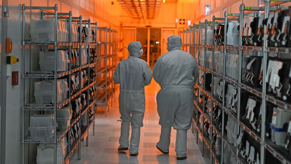 Mitarbeiter der Nexperia GmbH gehen durch die sogenannten Reinräume des Halbleiterproduzenten in Hamburg