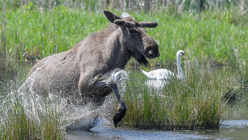 »Also wenn man einen Elch sieht,sollte man sich darüber freuen,weil das ist ein wenig wie ein Lottogewinn. Es kommt eben nicht so häufig vor«,erklärt Biologe Striese. Ganz ungefährlich seien die Tiere aber nicht. Von Hunden etwa könnten sie sich bedroht fühlen. Mitunter seien sie aber auch einfach neugierig.»Und deswegen sollte man halt schon 30 bis 40 Meter Abstand halten.« Die Tiere treten,wenn sie sich verteidigen müssen,sehr gezielt mit den Vorderhufen aus,erklärt der Elch-Fachmann. »Selbst ein einjähriger Elch wiegt schon über 150,200 Kilo. Wenn die uns so schubsen,wie sie das untereinander machen,sind wir reif fürs Krankenhaus.«