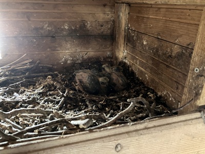 Nach der Terminabsprache mit der neuen Besitzerin konnten sie die Mühle betreten und mit der Reinigung im 5. Stock beginnen. Schon im ersten Kasten konnten sie zwei Dohlenküken antreffen. Überrascht wurden die beiden auch durch die Anwesenheit eines Waschbären,der es sich in einem der Kästen bequem gemacht hatte. Nachdem Sie den Waschbären vergrämt hatten,konnten sie die restlichen Brutkästen fertig säubern. Schon nach einer Stunde war die Arbeit erledigt. Toll ist es auch das dieses Gebäude der Mühle jedes Jahr ab Anfang Mai bis Ende August das Sommerquartier von mindestens 28 Mauerseglerpaaren ist. Sie