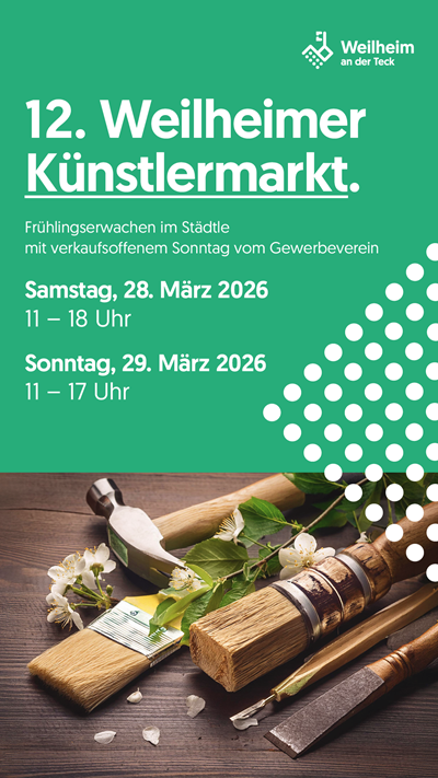 Am Samstag, 28. März 2026 von 11 bis 18 Uhr und Sonntag, 29. März 2026 von 11 bis 17 Uhr werden wieder eine Vielzahl an Ausstellern und Akteuren im Städtle die Besucher verzaubern. Der seit 2013 in der Schlossscheuer stattfindende Künstlermarkt erfreut sich immer größer werdender Beliebtheit. Ein bunter Mix aus bewährten und geschätzten Künstler der vergangenen Jahre und ...